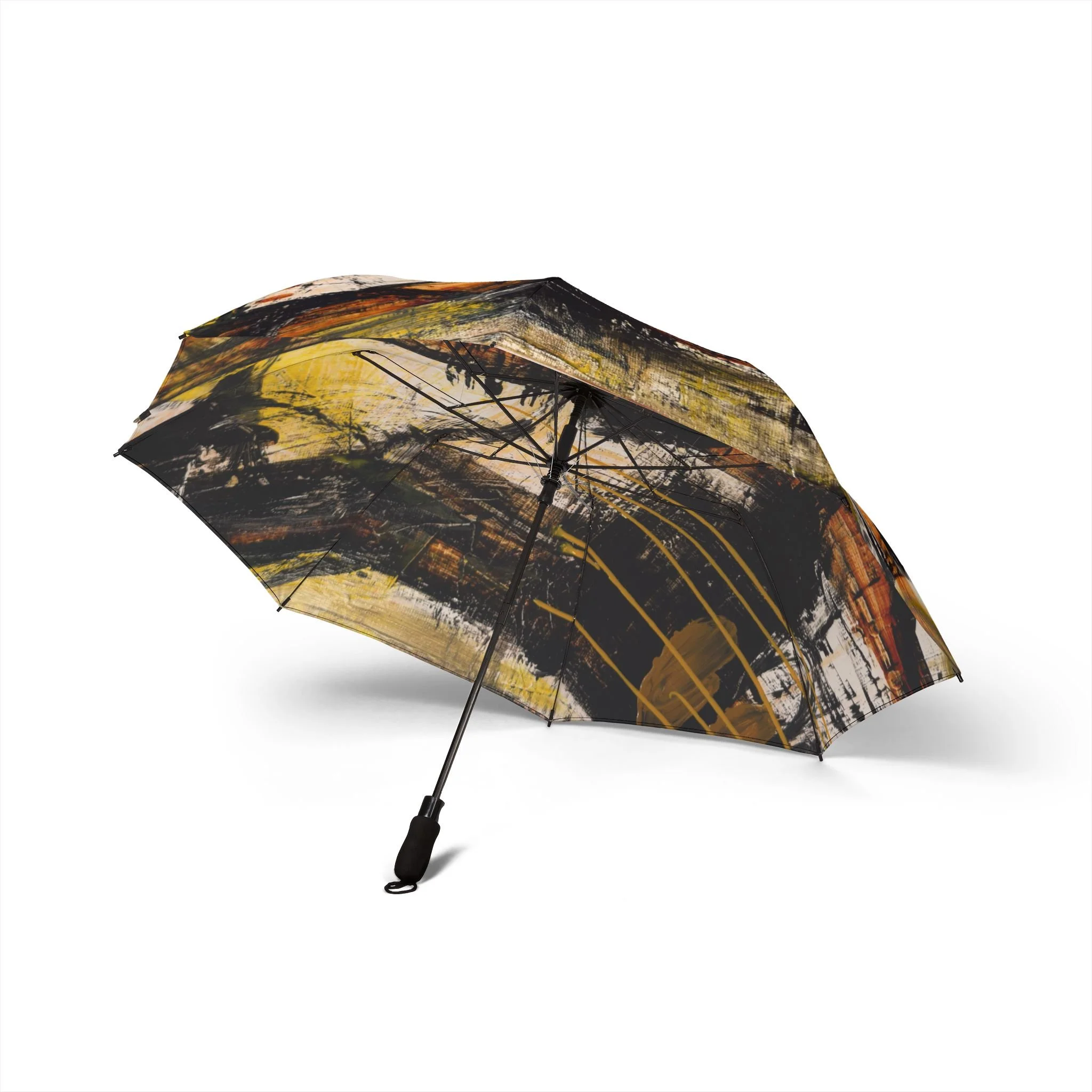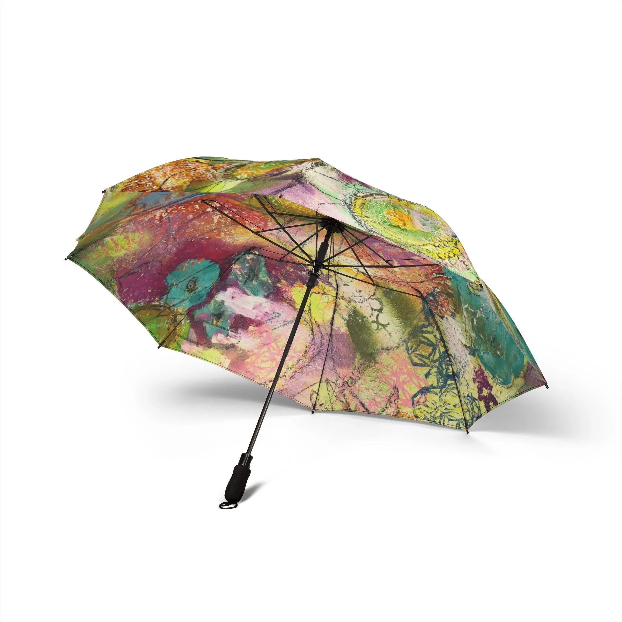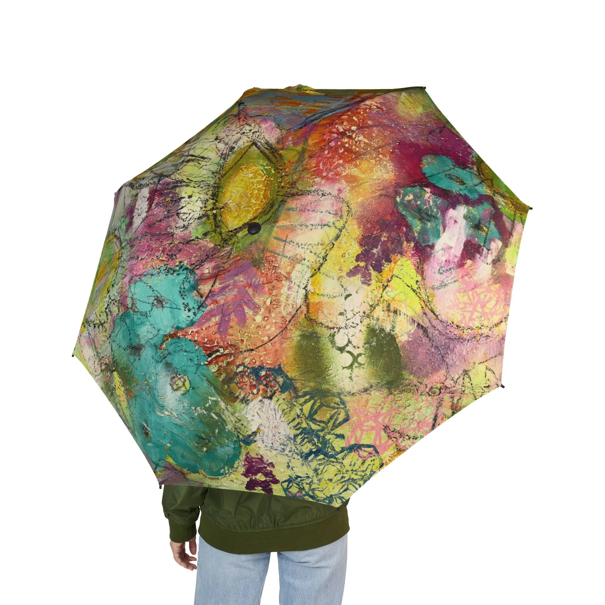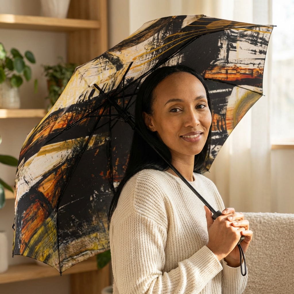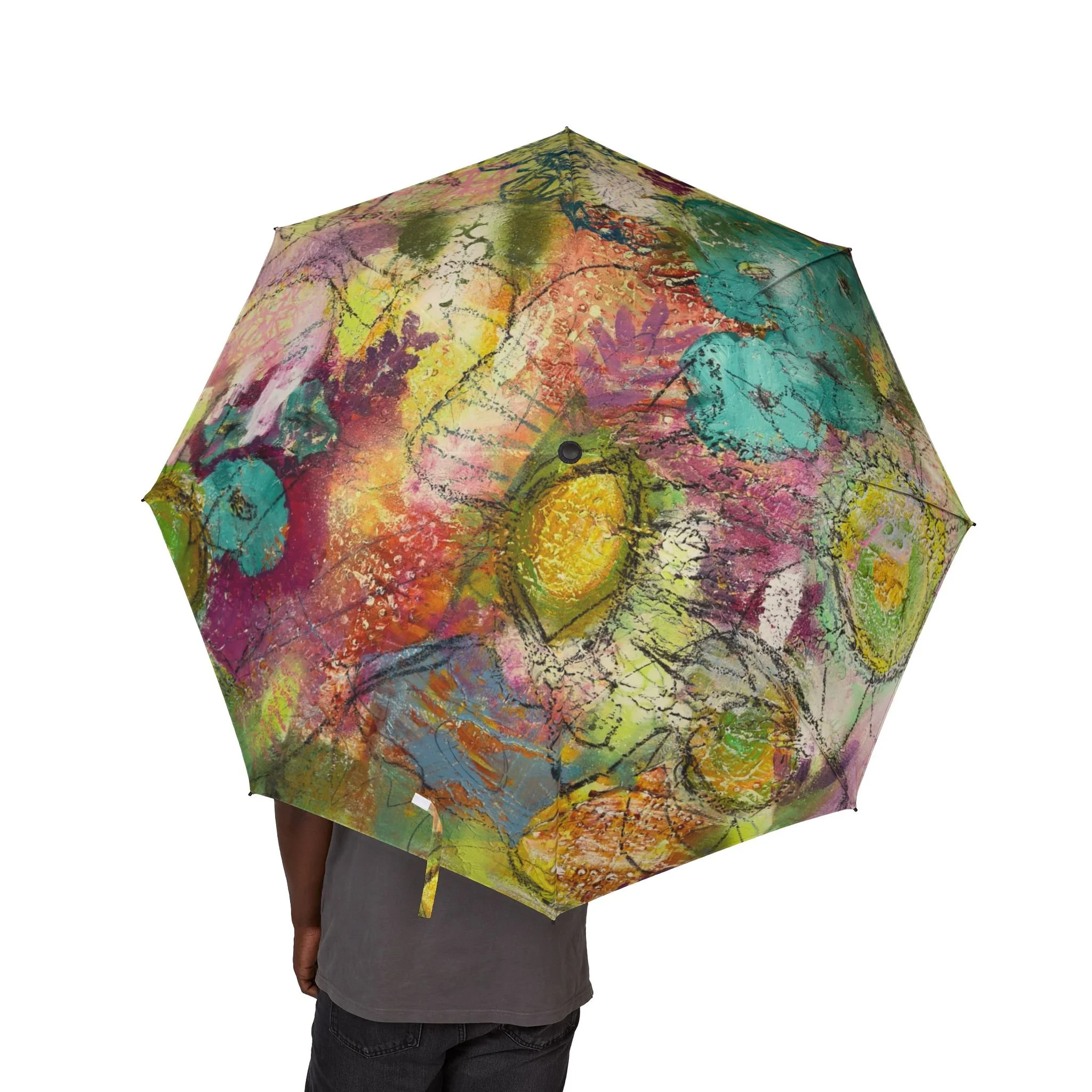 Bright, painterly blooms swirl across this compact umbrella like a watercolored street mural — cheerful, slightly wild, and full of movement. Lightweight yet sturdy, it opens in a single smooth motion so you can step out without fumbling. The rich, dye-sublimated print resists fading and continues to glow after many rainy walks. Keep it tucked in your bag or clipped to a tote; the matching sleeve and wrist strap make it easy to grab on your way out. This umbrella brings color and calm to rainy commutes, art fairs, and slow afternoon strolls through the city.